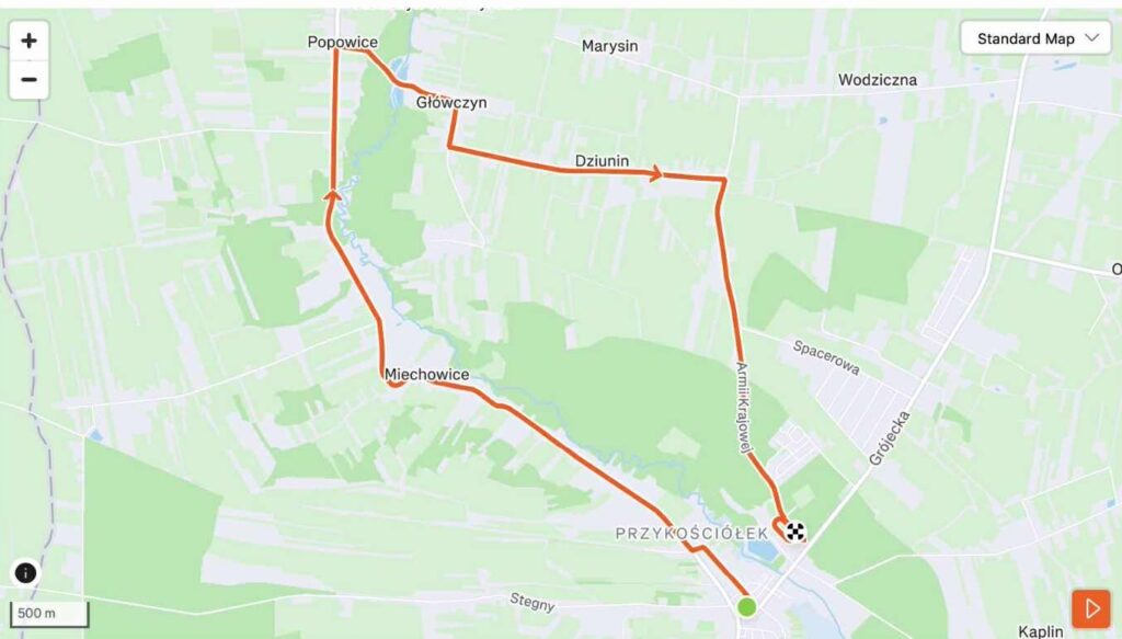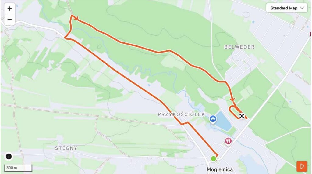 Trasa: Rynek w Mogielnicy – ul. Wolska – Miechowice – skręt w prawo na most Marosa – powrót lasem do ul. Armii Krajowej – Kompleks Sportowy przy PSP Nr 2 w Mogielnicy