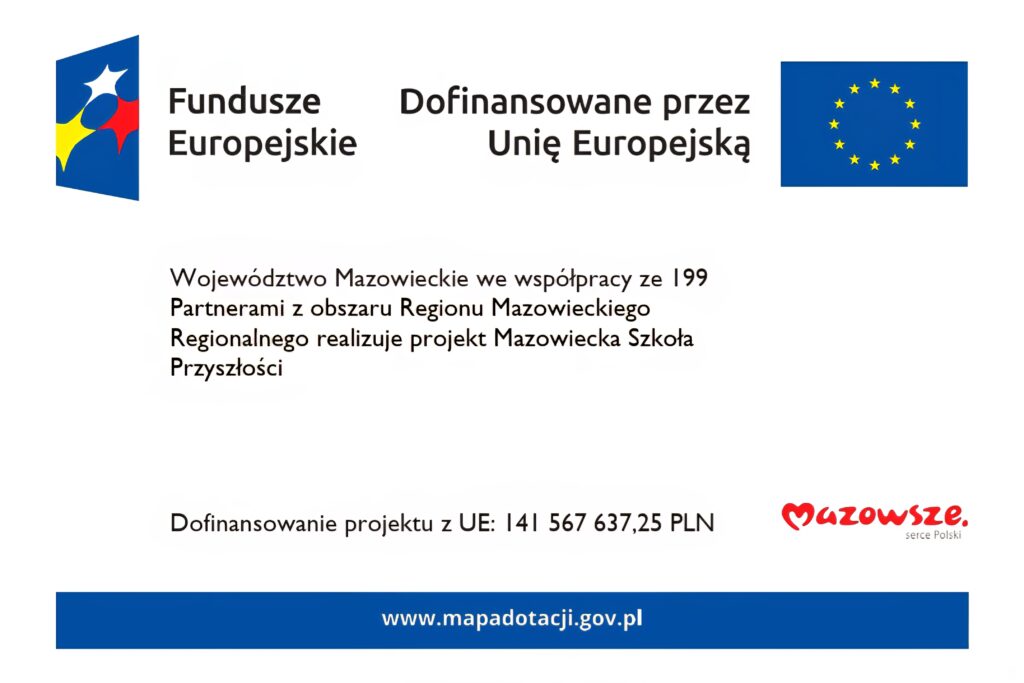 Projekt jest dofinansowany ze środków Unii Europejskiej w ramach Programu Fundusze Europejskie dla Mazowsza 2021–2027, Priorytet VII „Fundusze Europejskie dla nowoczesnej i dostępnej edukacji na Mazowszu”, Działanie 7.2 „Wzmocnienie kompetencji uczniów”.