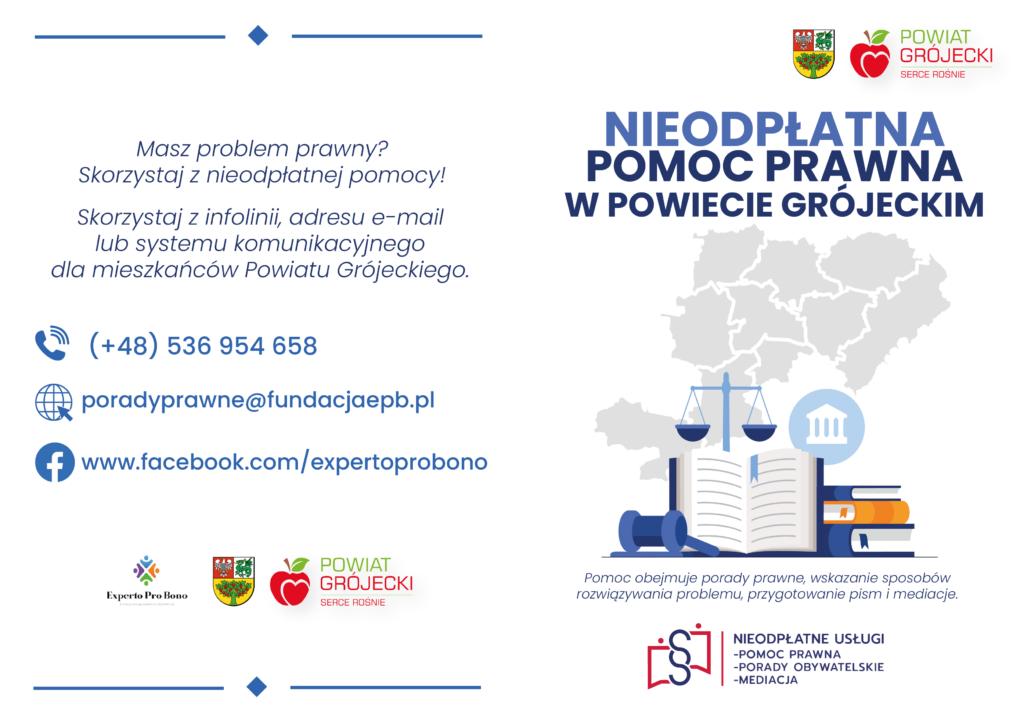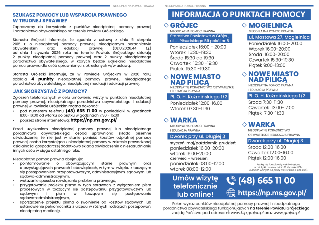 Starosta Grójecki informuje, że w Powiecie Grójeckim w 2026 roku, działają 4 punkty nieodpłatnej pomocy prawnej, nieodpłatnego poradnictwa obywatelskiego, nieodpłatnej mediacji i edukacji prawnej: