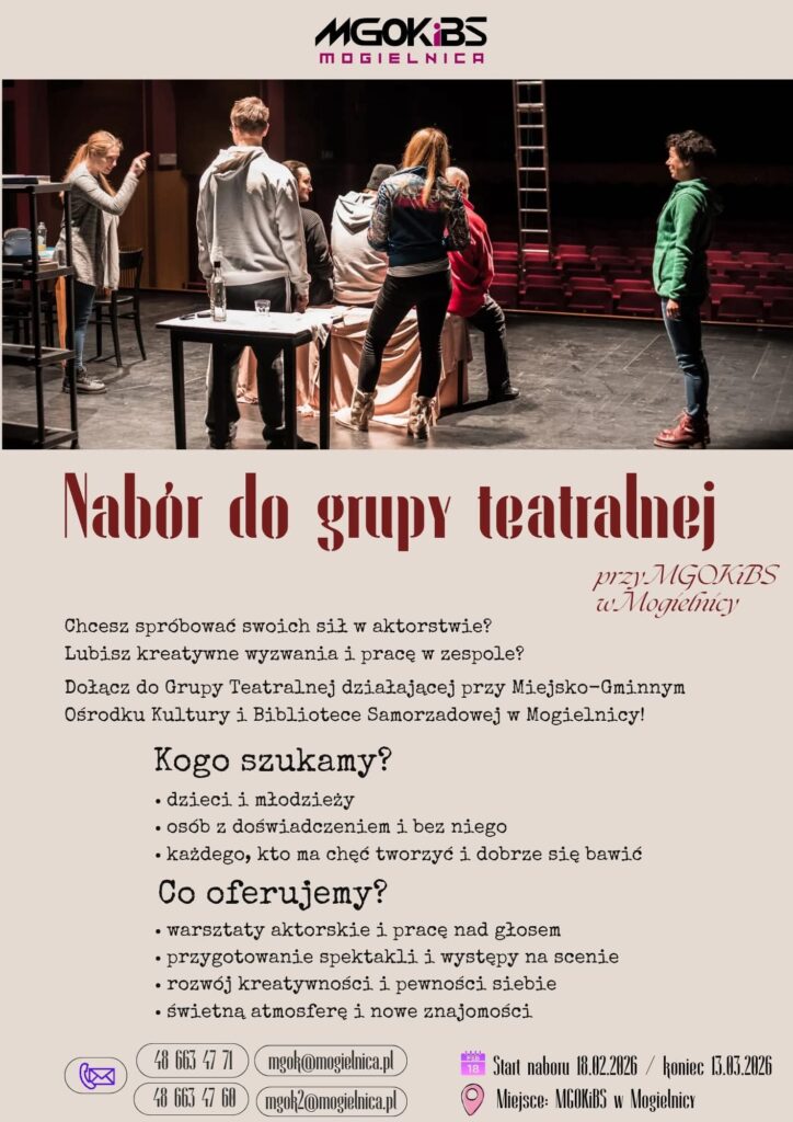 W związku z tym ogłaszamy 🎭 Nabór do Grupy Teatralnej przy MGOKiBS w Mogielnicy 🎭