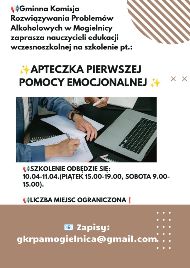 Gminna Komisja Rozwiązywania Problemów Alkoholowych w Mogielnicy serdecznie zaprasza nauczycieli edukacji wczesnoszkolnej do udziału w rekomendowanym szkoleniu profilaktycznym pn. „Apteczka Pierwszej Pomocy Emocjonalnej”.