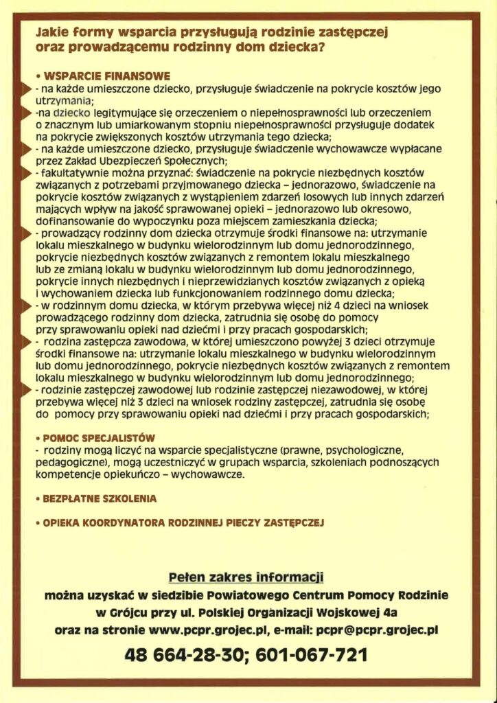 Pełen zakres informacji można uzyskać w siedzibie Powiatowego Centrum Pomocy Rodzinie w Grójcu (ul. POW 4a, 05-600 Grójec)