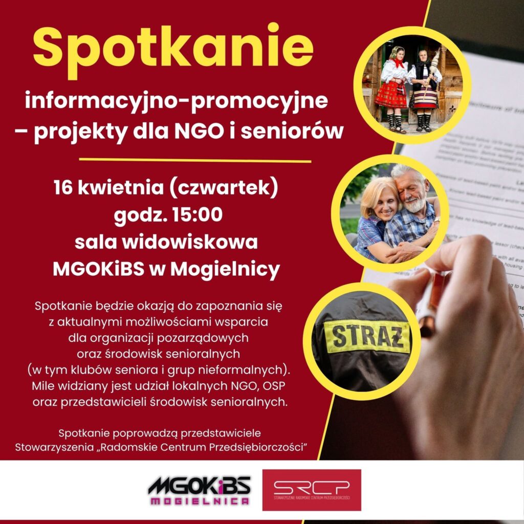 MGOKiBS w Mogielnicy zaprasza przedstawicieli Kół Gospodyń Wiejskich, organizacji pozarządowych, Ochotniczych Straży Pożarnych oraz środowisk senioralnych (w tym klubów seniora) na spotkanie informacyjne dotyczące dostępnych form wsparcia i nowych projektów.